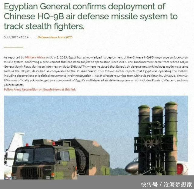 埃军退役少将萨米尔.法拉格在接受萨达.巴拉德电视台采访时表示,埃及的防空网络包括多种先进反导系统,如HQ-9B,该系统被描述为与俄罗斯的S-400相当。这意味着HQ-9B现在被正式承认为埃及多层防空系统的组成部分。而HQ-9B在印巴空战中发挥了关键作用,因此可以说埃及空军部署HQ-9B,迈出了打造中式“杀伤链”第一步。现在,HQ-9B就可以在西奈半岛给以色列空军F-35I划出禁区。